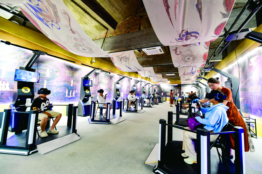 游客在敦煌体验“寻境敦煌——数字敦煌沉浸展”。 新华社发