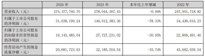 2024年,公司实现营业收入2.75亿元,同比减少0.96%;归属于上市公司股东的净利润3163.82万元,同比减少78.33%;归属于上市公司股东的扣除非经常性损益的净利润1914.55万元,同比减少30.95%;经营活动产生的现金流量净额2068.17万元,同比减少35.74%。